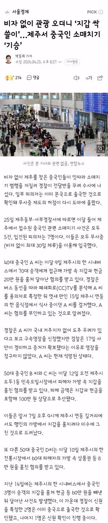 비자 없이 관광 오더니 ‘지갑 싹쓸이’…제주서 중국인 소매치기 ‘기승’