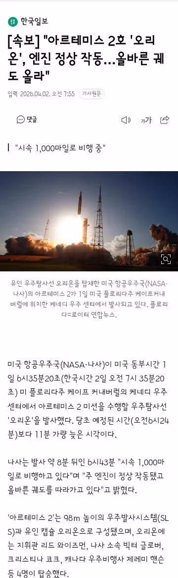아르테미스 2호 '오리온', 엔진 정상 작동…올바른 궤도 올라.