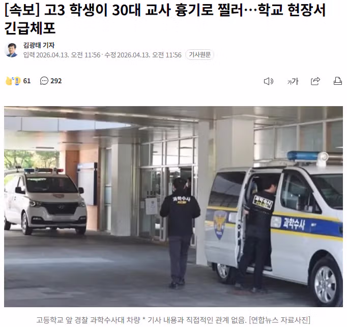 [속보] 고3 학생이 30대 교사 흉기로 찔러…학교 현장서 긴급체포