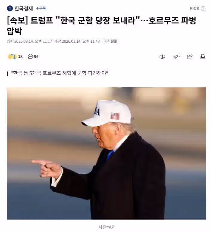 [속보] 트럼프 "한국 군함 당장 보내라"…호르무즈 파병 압박