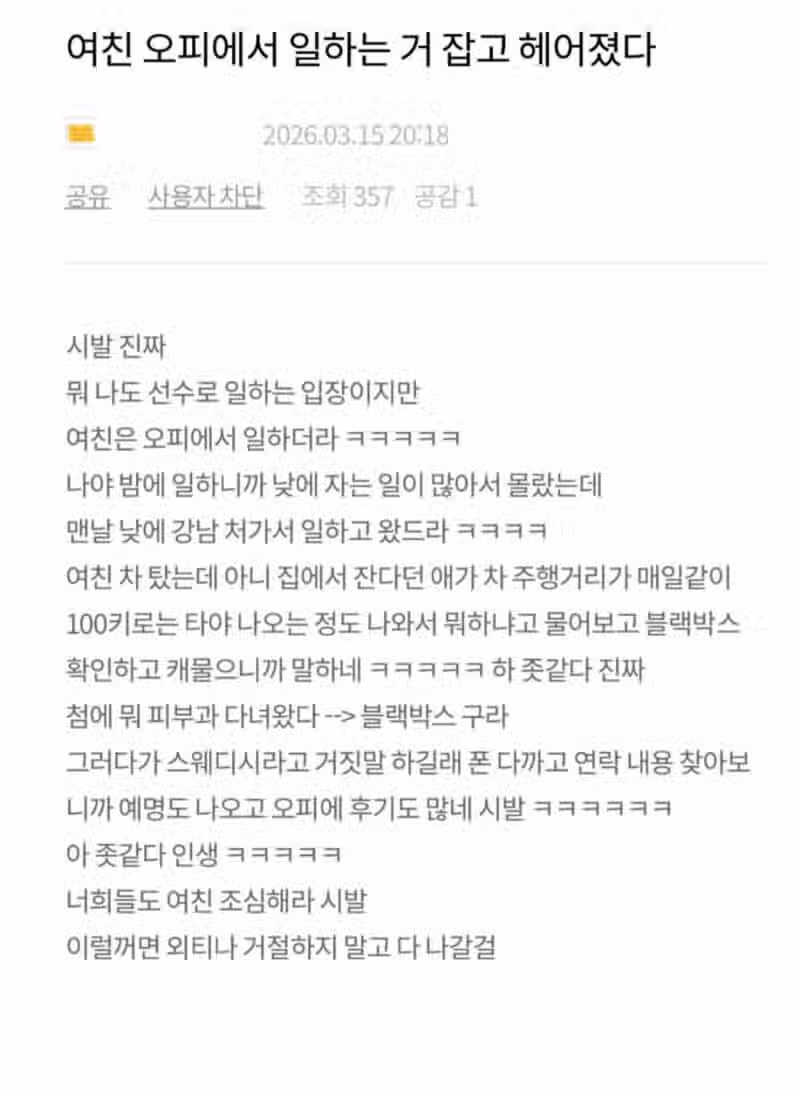 여친이 오피녀인거 걸려서 헤어졌다는 호빠 선수.