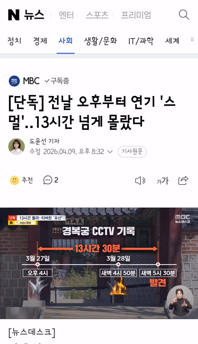 경복궁 최근 일부 화재사고..13시간동안 몰랐다.