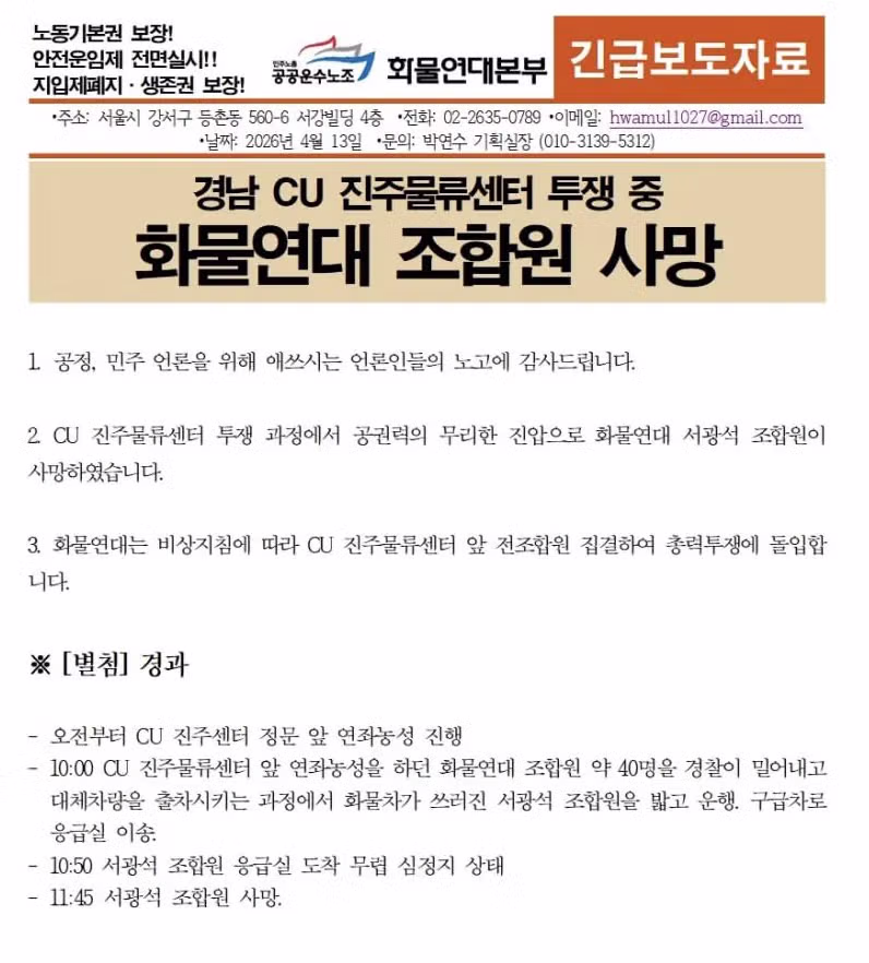 사람죽은건 안타깝긴한데 화물노조 너무 폭력적이라 좀 꺼리게 되네요