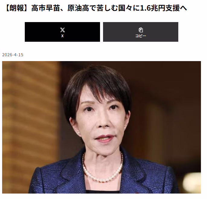 【속보】 다카이치 사나에, 원유 가격 상승으로 고통받는 국가들에 1.6조 엔 지원