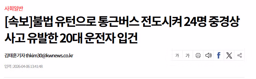 불법 유턴으로 통근버스 전도시켜 24명 중경상 사고 유발한 20대 운전자 입건
