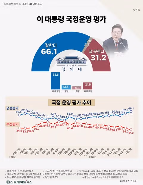 [스트레이트뉴스 여론조사] 李대통령 국정평가 긍정 66.1% 최고치…TK도 긍정 우세