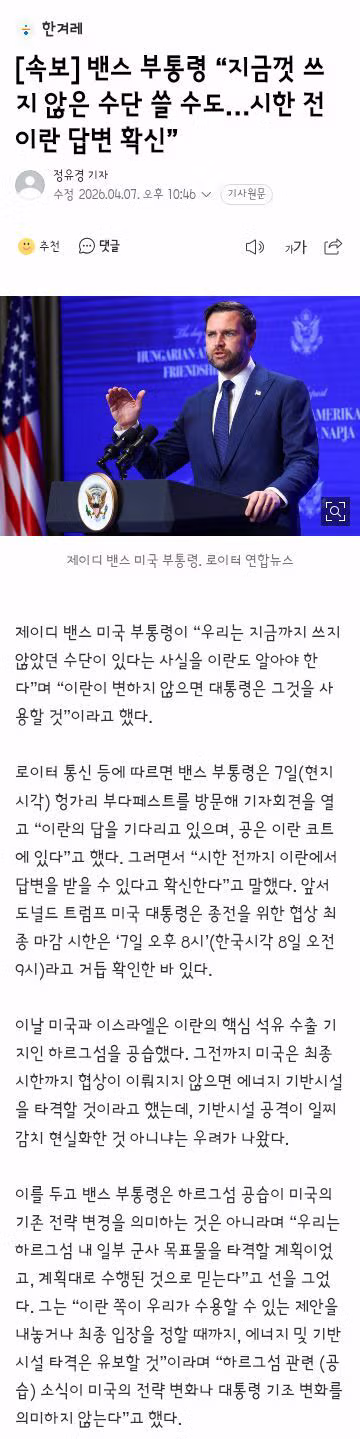 밴스 부통령 “지금껏 쓰지 않은 수단 쓸 수도…시한 전 이란 답변 확신”