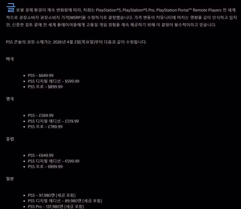 PS5 글로벌 가격인상 4월2일부터 인상가격 팝니다