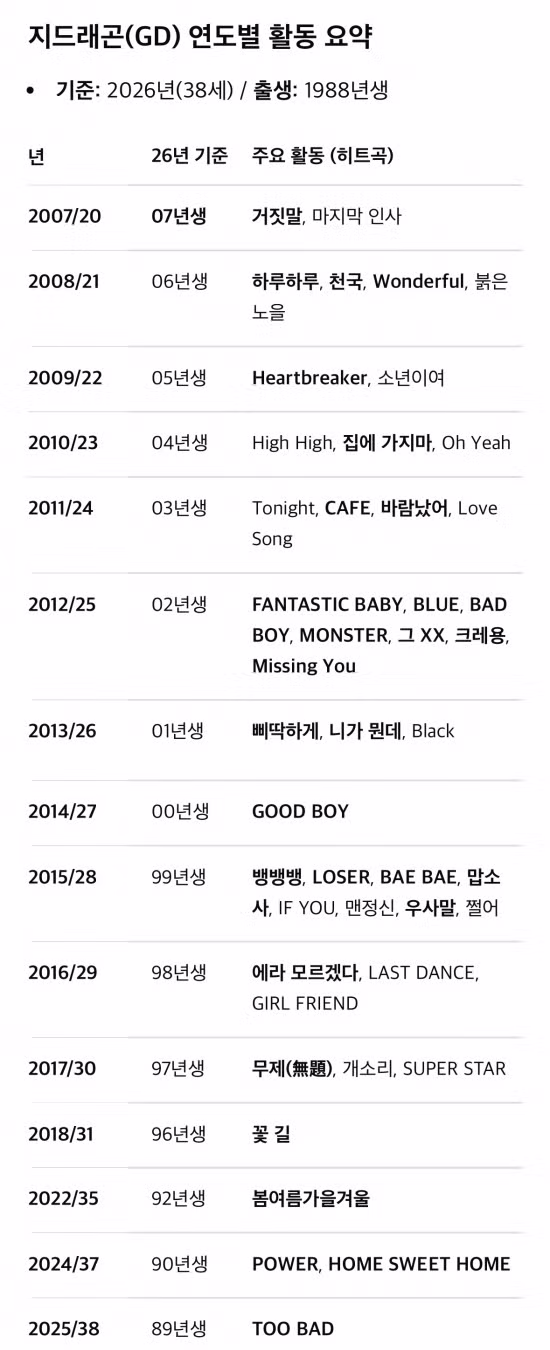 지디 나잇대별 히트곡 커리어