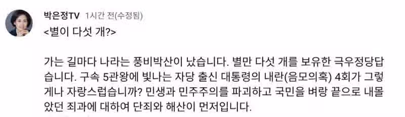 박은정 페북 <별이 다섯개?> 해산이 먼저