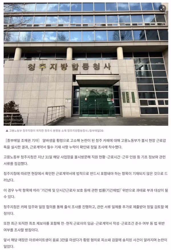 '알바생 고소’ 청주 카페, 근로계약서 기재 누락 적발