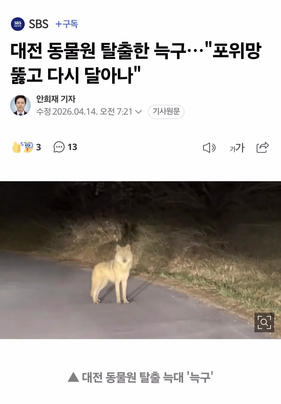 대전 동물원 탈출한 늑구…"포위망 뚫고 다시 달아나"