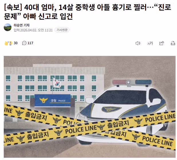 [속보]40대 엄마, 14살 아들 흉기로 찔러...