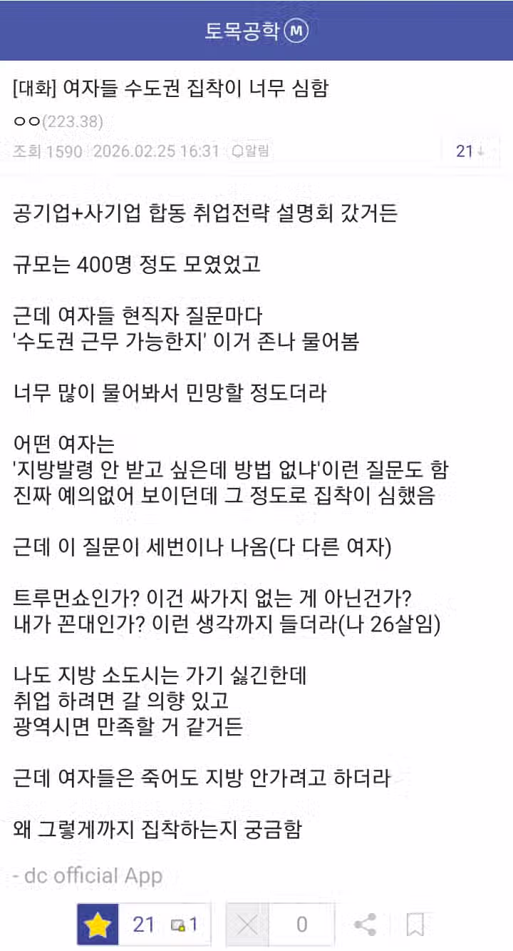 취업 설명회 갔다왔는데 여자들 수도권 집착이 너무 심한거아님?