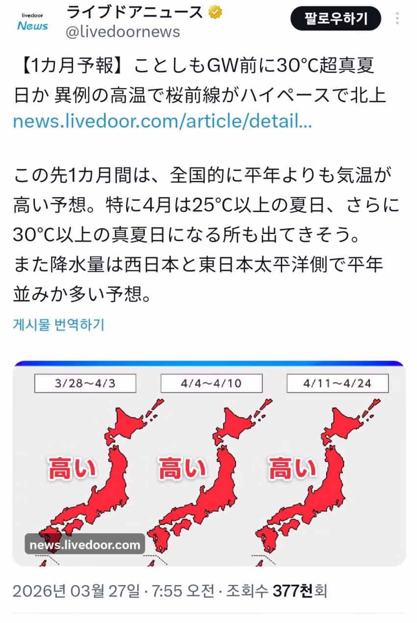 일본 4월부터 기온 30도 예측 ㅋㅋㅋㅋ