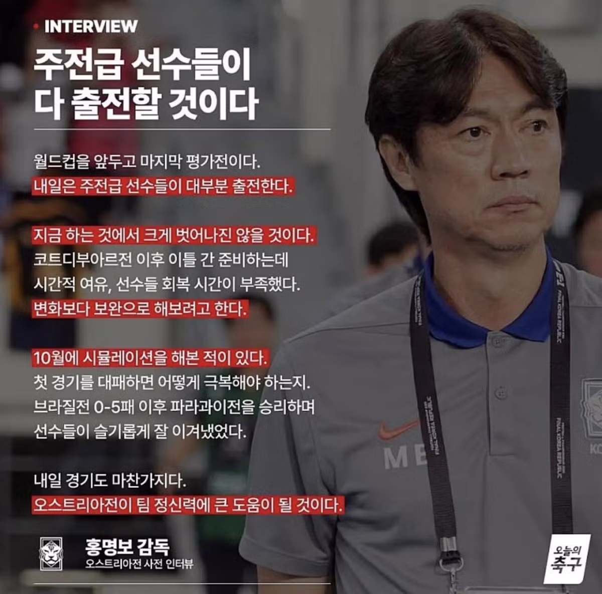 홍명보, “내일 오스트리아전 주전 모두 출격..정신력에 큰 도움 될 것”