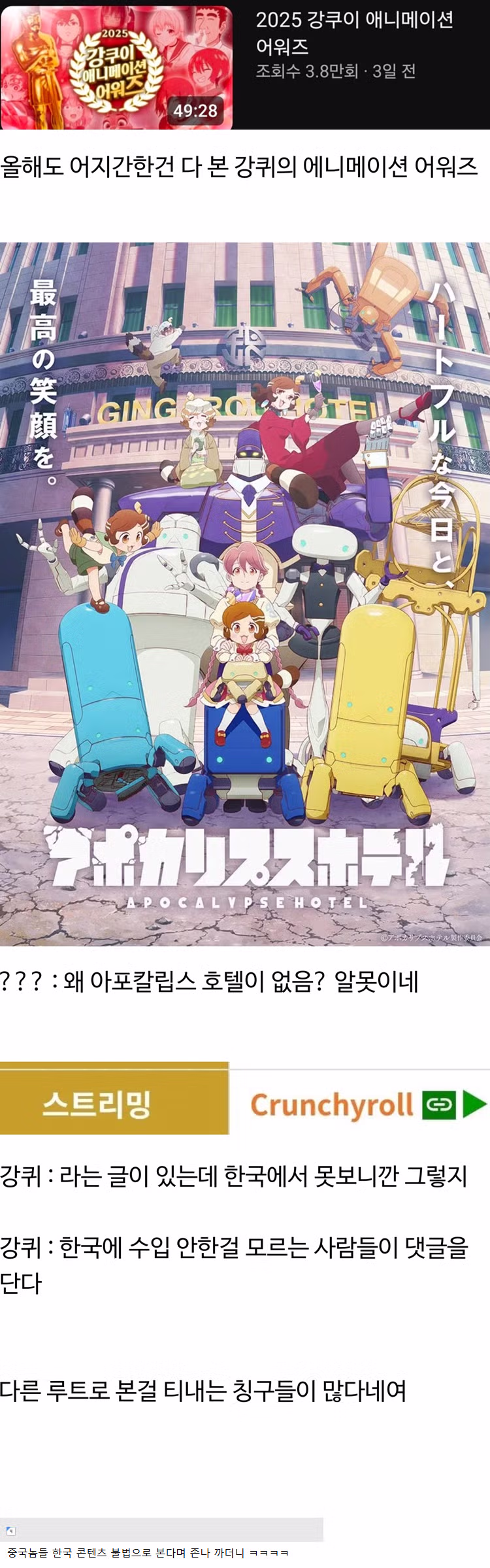 애니 평가하는 유튜버에게 달린다는 댓글