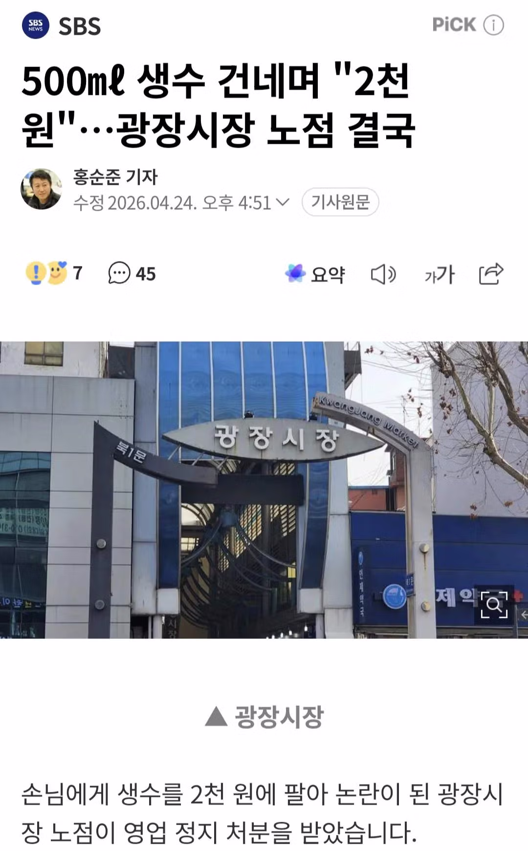 생수 건네며 2천원... 광장시장 노점 결국 영업정지 - 밈카세