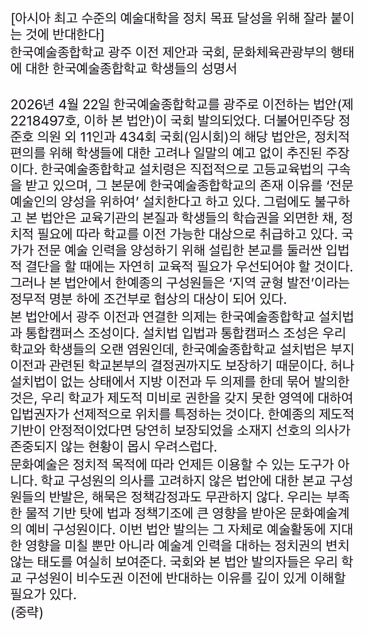 전라도로 옯기는거에 빡친 한예종 성명 발표...jpg - 밈카세