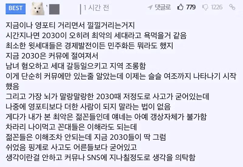 시간지나면 2030이 오히려 최악의 세대라고 욕먹을거 같다는 펨코 유저