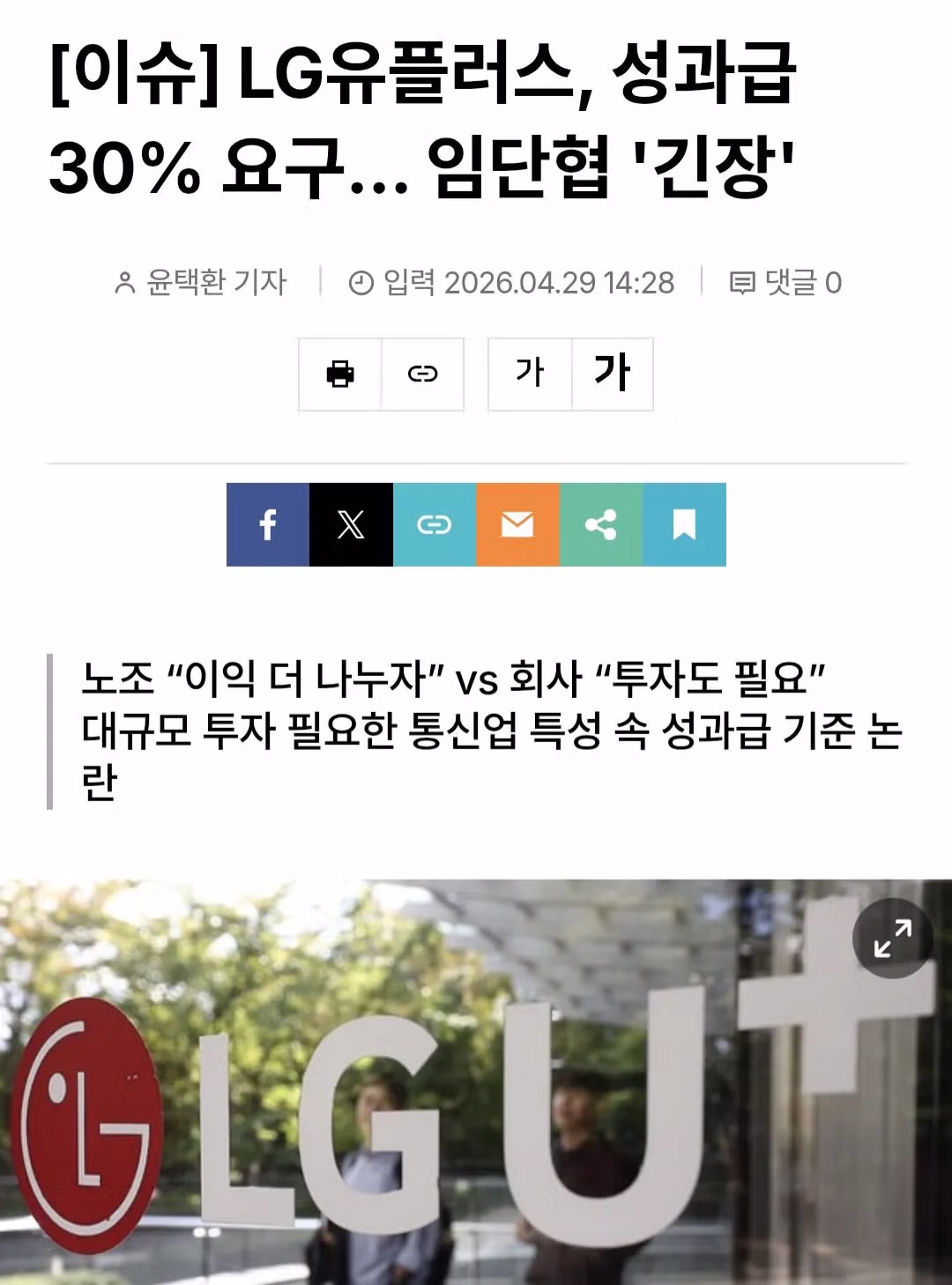 LG유플러스 노조, 순이익 대비 50% 성과금 요구 입갤 ㅋㅋㅋㅋㅋ