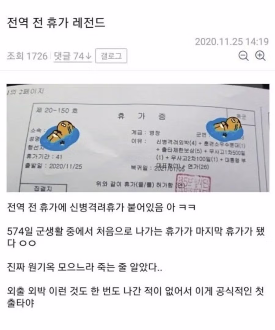 첫휴가라는거보니 부럽진 않네중간중간 나가서 바람도 쐬고 휴식도 좀 하고 그래야하는데 코로나로 나가지도 못하고 전역전에 저렇게..