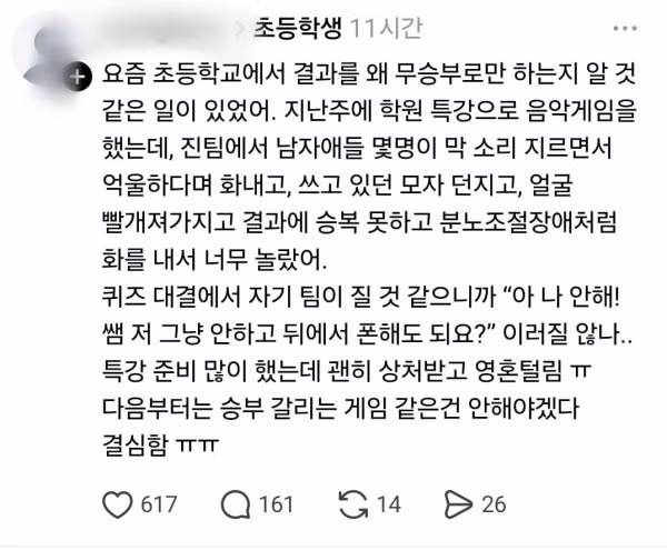 요즘 초등학교에서 결과를 왜 무승부로만 하는지 알 것 같은 일이 있었어