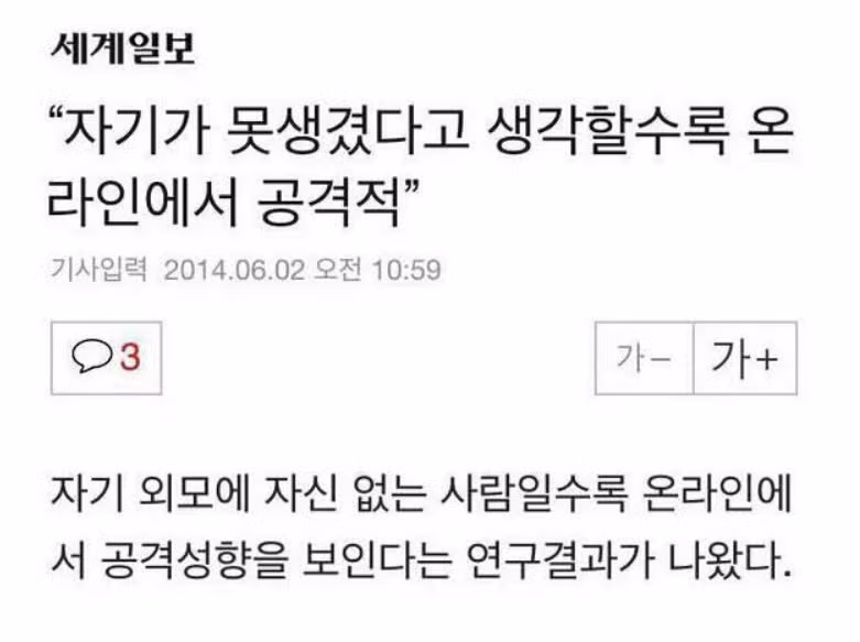 자기가 못 생겼다고 생각할수록 온라인에서 공격적