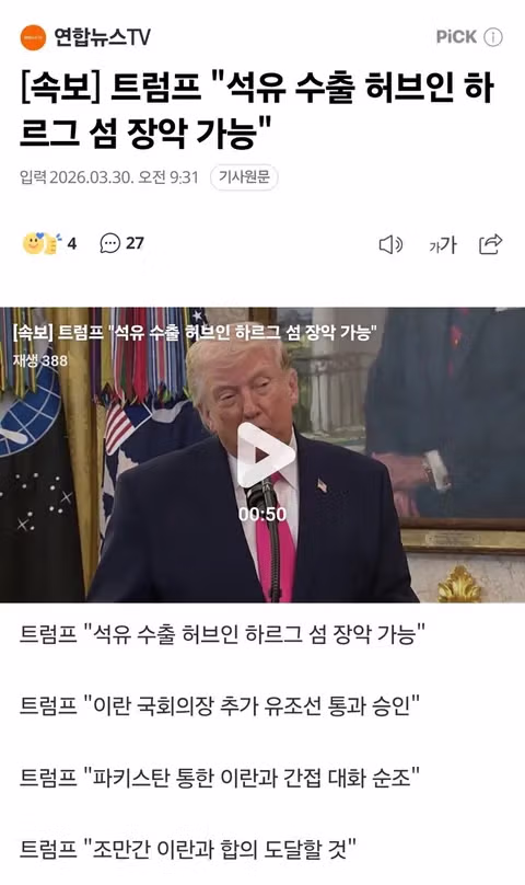[속보] 트럼프 "석유 수출 허브인 하르그 섬 장악 가능"